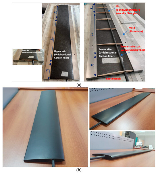 Mitrotta et al. [16] introduced an innovative design methodology using Proteus, OptiBLESS, and MSC Nastran for aeroelastic tailoring, optimization, and analysis, respectively. Employing the Multidisciplinary Design Optimization (MDO) approach across various studies [17,18,19,20,21,22], they focused on minimizing wing weight under both static and dynamic aeroelastic conditions. Benaouali and Kachel [23] automated the numerical simulation for optimizing aircraft wings, achieving an 8.9% range increase by considering design variables. Sinha et al. [24] showcased the strength-to-weight superiority of composite wings over aluminum using DLR-AE automated aeroelastic software (version v.3), cpacs-MONA. Silva et al. [25] optimized composite wings, considering strength, buckling, and flutter criteria. Saporito et al. [26] developed a framework for early-stage conceptual design, integrating dynamic aeroelastic constraints for aircraft wing optimization. Highlighting the importance of incorporating aerodynamic loads in the optimization of wing structure, Rajpal et al. [27] emphasized the need for a comprehensive approach. Kilimtzidis and Kostopoulos [28,29] proposed a numerical algorithm for obtaining the optimal stacking sequence of high aspect ratio composite wings, considering static aeroelasticity. However, there remains limited literature on experimental datasets for tailored composite wings. Early research has focused on the testing of wings modeled as plates [30,31], which are tailored to enhance the aeroelastic behavior through the bend-twist coupling of the composite laminate. A concentrated effort on optimization, manufacturing, and testing of an aeroelastically tailored wing with a representative cross-section using composite materials was made at the German Aerospace Center (DLR) [32,33,34,35]. In these studies, the wing is manufactured using load-carrying skins filled with foam, with the foam serving to provide resistance against buckling. Ribs and spars are intentionally omitted from the wing to simplify the manufacturing process. Meddaikar et al. [32] investigated aeroelastic tailoring in composite wing design for optimized stiffness. Wind tunnel tests confirm the design’s validity, aligning well with simulations. The paper gives an overview of the optimization framework, wing manufacturing, and experimental setup, presents wind tunnel results compared to simulations, and concludes with key findings. The absence of ribs and spars led to the exclusion of buckling constraints in the optimization, as thick laminates would be necessary to address the large buckling field. Turgut [36] focuses on the manufacturing of a lightweight composite wing. The study aims to contribute insights into optimizing the design and performance of UAV wings through a holistic examination of manufacturing processes, material properties, and structural considerations. Validating a numerical design approach for optimizing composite wings under gust and fatigue loading, Rajpal et al. [37] demonstrated its effectiveness. In contrast to traditional methods, they employed an analytical fatigue model to enhance accuracy and exploit the potential of composite materials. A critical rectangular composite wing is designed, manufactured, and tested in the wind tunnel, and fatigue experiments are performed to validate both aeroelastic and fatigue predictions. The study confirms the success of the design methodology yet highlights stiffness degradation due to fatigue, affecting the aeroelastic response.