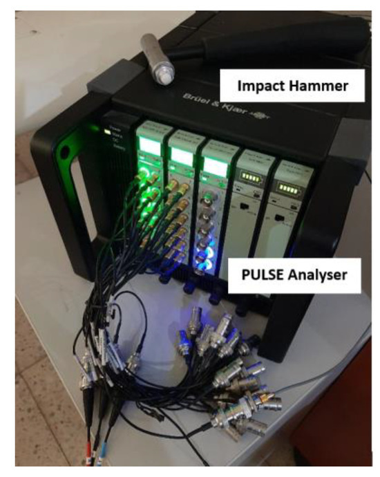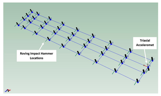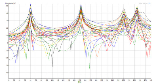The roving hammer method (with a frequency span of 400 Hz and by zooming into 280 Hz, covering the first four global modes of the wing with 800 FFT lines through linear spectrum averaging over three hits at each measurement point) is performed at 36 different locations, and corresponding frequency response functions are obtained and provided in Figure 26.