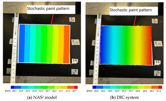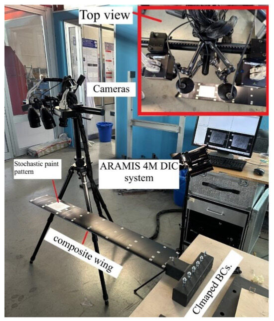Subsequently, the recorded data is processed using the ARAMIS software version 1.02, comparing and calculating displacements and deformations. Concurrently, finite element analysis in NAS2 is conducted, importing the experimental data to validate and complement the results obtained from the DIC system. The procedure ensures a comprehensive analysis of the static deflection behavior of the composite wing under different loads, combining the precision of the ARAMIS DIC system with the numerical simulations of NAS2 for a thorough understanding of the structural performance of the composite wing. Results are meticulously documented, encompassing experimental measurements, load values, and any pertinent observations from the DIC system and NAS2.