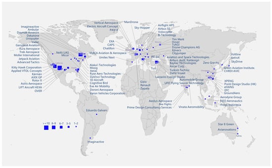 Figure 1 summarizes the geographical origin of almost 250 different multicopter designs for UAM purposes [11]. The size of the symbols represents the number of passengers for different manufacturers. The main configurations for multicopters are based on coplanar and coaxial rotors. Other configurations like ducted fans appear further from application. Some manufacturers reported more than two passengers, but none has yet demonstrated a corresponding flight test yet. In the category of one- and two-passenger UAM vehicles, very few have been subjected to full-scale flight tests, and even fewer have any outlook for successful certification and commercial launch in the foreseeable future [11]. Representative UAM multicopters and the features are depicted in Figure 2.