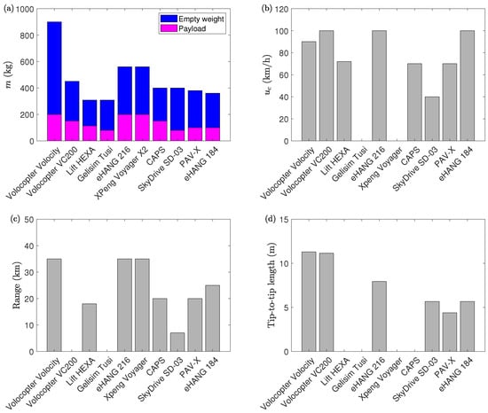 (a) Payload and empty weight of existing UAM multicopter designs. (b) Cruise speed. (c) Flight range. (d) Multicopter size quantified by tip-to-tip distance. Missing data points are due to unavailability of data in the public domain.