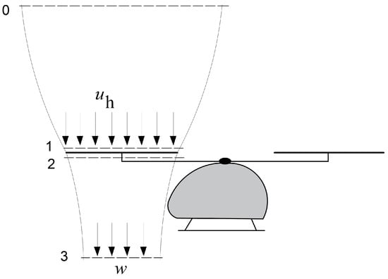 Between the locations far upstream and far downstream, a stream tube is defined to contain the flow entering and leaving the actuator disk. The flow is analyzed at four planes in the stream tube: the plane far upstream denoted by ‘0’, just upstream denoted by ‘1’, just downstream denoted by ‘2’, and far downstream denoted by ‘3’, as depicted in Figure 3. The flow far upstream of the disk at the plane ‘0’ has the approximate velocity of during the hovering condition and a static pressure of ambient pressure of . After accelerating towards the disk, the static pressure decreases to , and the flow velocity increases to at the plane ‘1’. After the actuator disc at the plane ‘2’, the static pressure experiences a jump of , and the velocity remains at due to the continuity equation. Past the rotor, the flow is further accelerated due to the induced velocity of the rotor. At the plane ‘3’ far downstream of the disk, the static pressure decreases to the ambient pressure of , and the flow velocity increases to w [30,31].