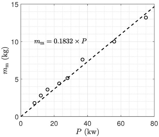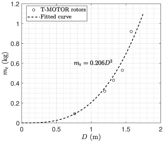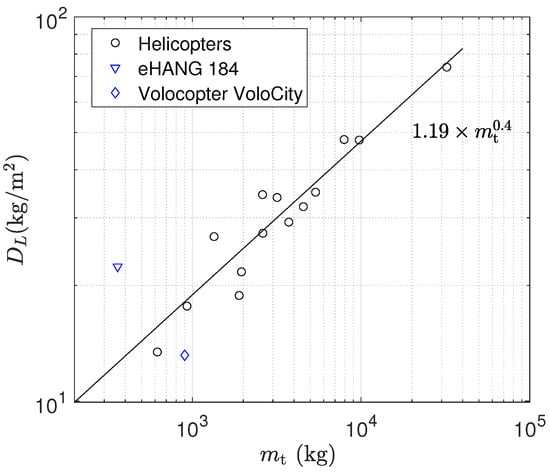 According to the square–cube law regarding the relation between the area and the volume (volume is proportional to the mass ) of an object, the disk loading is supposed to be [32]. However, the available data as shown in Figure 6 indicate a slightly steeper increase due to some nonaerodynamic constraints (e.g., weight limit of the rotor and greater torque requirements [32]).