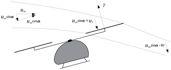 During forward flight, the multicopter has to be tilted forward of an angle to generate lift and propulsive force. The momentum theory introduced by [32,36,37] is applied to the UAM multicopter. With respect to the rotor axis, there is an axial velocity component and edgewise velocity . Adopting the blade tip velocity, the out-of-plane and in-plane velocities of the rotor are normalized [32]: