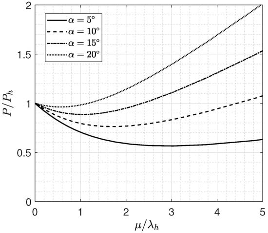 To analyze the interference factor, it is necessary to define a reference power without rotor interaction by assuming that the upper and lower rotors are far away from each other. This assumes that isolated rotor power is treated as reference data. The power for the isolated upper rotor of thrust T is , and for the lower rotor of thrust , it is . The true power of the coaxial rotors is plus Equation (38). Therefore, the interference factor is given by the ratio of the coaxial rotor power () versus the isolated rotor power ():