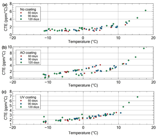 The Material Mission observation results show that the CTE has a temperature correlation. The CTE changes markedly on the high-temperature side, while no change is observed on the low-temperature side. The change in the CTE is almost the same for the first 120 days of observation. The results show that it is possible to observe the CTE in a space environment and that material degradation can be observed in real time by measuring the CTE. The PEEK/CFRTP materials were not degraded after 120 days in space [12,13].