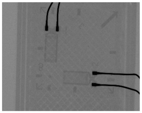 As for the strain gauges, the strain gauges are inserted between the samples. The samples to be mounted in this mission are all made using 3D printers. Therefore, during the manufacturing process, the equipment is stopped once when the sample is stacked to half its thickness, the strain gauge is placed on the sample, and stacking is restarted to sandwich the strain gauge into the sample. An X-ray image of the sample is shown in Figure 7.