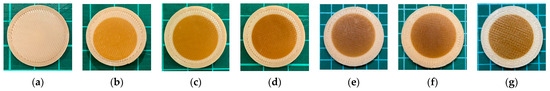 Appearance changes in 3D-printed PEEK materials in UV irradiation test: (a) 0 ESD, (b) 10 ESD, (c) 20 ESD, (d) 30 ESD, (e) 40 ESD, (f) 60 ESD, (g) 100 ESD.