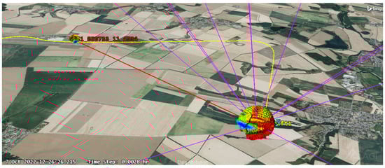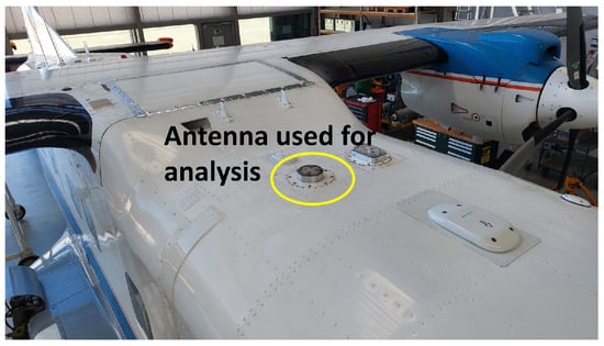 For the test scenario, flight data from the measurement campaign in Cochstedt, Germany, were taken as a reference. The flight route considered for the analysis is depicted in Figure 1. The measurements took place on 7 October 2022, between 12:26:26 and 12:29:48 UTC. The measurement campaign comprised the antenna described in [15] and is shown in Figure 2, which was installed on the DLR aircraft Do 228-101 D-CODE for flight tests.