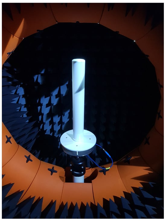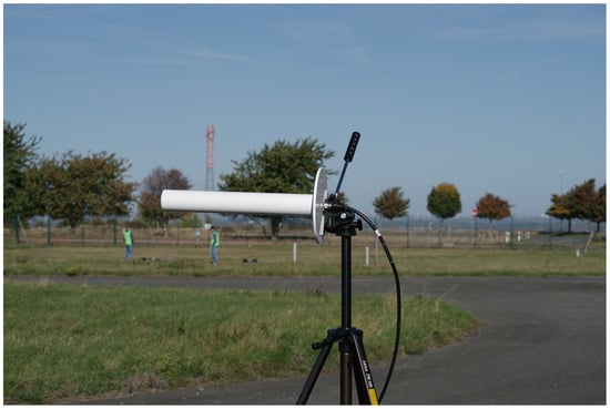 A high gain GNSS helix antenna (MAT-18X8.5H1.1-1.6R-P-XN1), covering the full GNSS band from 1.1 to 1.66 GHz, from Matterwaves, Torrance, CA, USA, was used to radiate jamming signals. The antenna was placed at 51.86020550°, 11.43341470°, 225.27 m (or 51°51′36.7″ N 11°26′00.3″ E 180.490 MSL) and was transmitting with a power of 10.5 dBm. It was installed on the ground using tripod as shown in Figure 3.