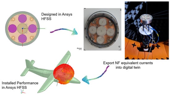 The approach for assessing the installed performance involved a hybrid method. This hybrid approach, as depicted in Figure 4, utilizes both simulation results and measured data to accurately assess the antenna’s performance when installed on the aircraft. First, the antenna design was carried out using commercial software Ansys HFSS (3D High Frequency Simulation Software) 2022 R2. Subsequently, the antenna was manufactured and measured in a semi-anechoic near-field chamber (MVG’s Starlab) at the DLR facility. The measured electromagnetic fields in the anechoic chamber were then converted to equivalent currents on an enclosing box. These equivalent currents were used as the antenna source in electromagnetic simulations performed on a digital twin of the D-CODE airplane. A more detailed explanation of the approach is presented in [19].