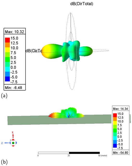 A simplified CAD (Computer Aided Design) model of the mentioned aircraft is available at the DLR facility; it was, therefore, used to simulate the installed performance of the antenna on the aircraft. Figure 5 illustrates both the original D-CODE aircraft and a simulated view of the antenna mounted on the aircraft using the Ansys HFSS. This allows for a visual comparison between the actual aircraft and the simulated antenna installation. Figure 6 shows the radiation pattern of one of the antenna elements of the selected antenna array measured in our Starlab and the radiation pattern obtained after simulating the installed performance of the antenna on aircraft. The reflections emanating from the aircraft contribute to the antenna’s installed radiation pattern, resulting in a modification of the overall pattern of the installed antenna.