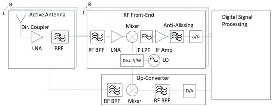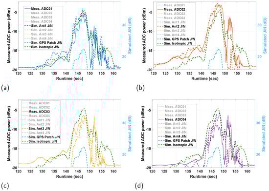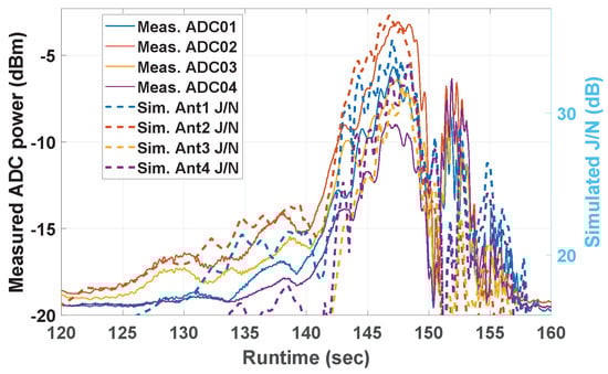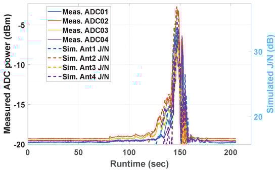 DLR’s in-house developed hardware receiver, i.e., GALANT receiver [20,21], is used in the measurement campaign, whose simplified block diagram is shown in Figure 9. M (number of antenna elements) antennas are linked to M RF frontends, each housing an analog-to-digital converter (ADC), which feeds into the digital signal processing stage. For the sake of comparison between simulation and measurement, the measured power levels at the ADC input will be considered and compared with the jammer-to-noise (J/N) ratio (carrier-to-noise (C/N) ratio of the jammer) obtained from the simulation, as shown in Figure 10. Figure 11 shows the comparison between measured ADC power and simulated J/N in the specific time window where jammer power is highest at reception on the airborne side. As mentioned earlier, our signal reception setup utilizes four L1 elements, resulting in four antenna outputs that are available for comparison in the plots. A very good agreement between simulation and flight data can be observed. Having an estimate of the received interfering power anticipated in a flight scenario is highly beneficial in order to eventually plan countermeasures/adapt the interference suppression algorithms.