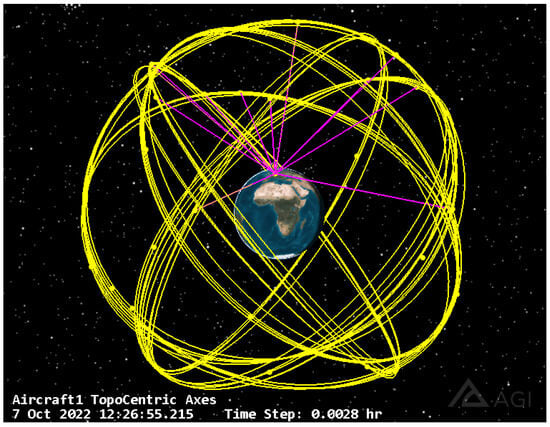 Simulated view of earth with GPS satellites (Yellow lines indicate the orbit of the satellites and pink lines indicate the connections between the GNSS satellites and the receiver).