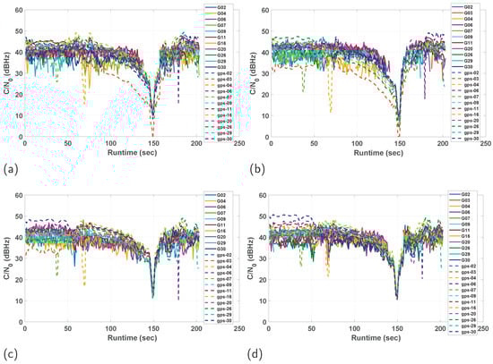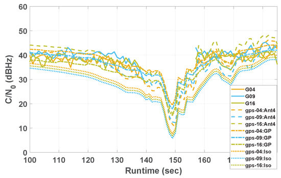The simulated and measured results, including the C/N0 values at L1, are depicted in Figure 15. The figure depicts the congruent reception of signals from corresponding satellites during measurement and simulation. Figure 16 illustrates the specific time period when the jammer becomes effective. It is evident that during the time interval between 120 and 160 s, all (single) antennas experience a loss of signal tracking to the satellites. This loss of connection occurs because jamming is overpowering the signal.