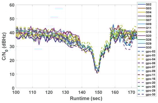 The receiver employs a tracking threshold of 30 dB-Hz to monitor the satellites. When the signal strength drops beneath a predefined threshold, especially in the presence of jamming, the reception diminishes to zero, signifying a complete loss of signal. This decline is evident in the plots. Furthermore, the received carrier-to-noise ratio (C/N0) values in the simulation setup also experience a significant decrease during the same time frame. This indicates that the simulation accurately reproduces the real-life scenario, as the observed loss of signal during the jamming period aligns with the simulation results.