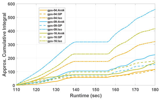 , and is the spacing between each consecutive pair of points. C/N0Meas denotes the measured C/N0 values with Ant. 4 while C/N0Sim denotes the simulated values with Ant. 4 (as in our approach), GPS patch antenna or isotropic antenna. The integral results for the selected satellites with all intermediate values are shown in Figure 18. From Figure 17 it can be seen that in this case the isotropic antenna incorrectly predicts the signal drop before it actually occurs and Figure 18 confirms this as the integral value becomes very high (2.5–3 times) over the period analyzed as compared to our approach. On the other hand, the GPS common patch antenna pattern is more similar to our predictions and the measured data in this case (as expected, since the actual antennas have a pattern similar to the one of a patch), but underestimates signal (and jammer) reception at low elevations, as mentioned in the Scenario 1.