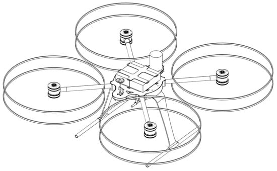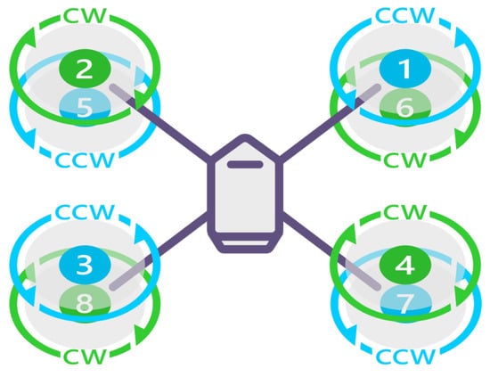 The UAV multi-rotors were configured to rotate in opposite directions to balance the torque generated by each rotor; the rotation direction and notation of each propeller are presented in Figure 2. The rotation speed of the rotors was based on commanded orientation signals in the form of the Euler angles , , and . The commanded orientation signals were then converted to motor commands with the aid of a mixer matrix (See Equation (1)).