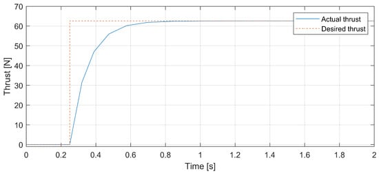 For both of the autopilots, the limitations such as the Euler angles and angular velocities were set. For the pitch and roll angles, the maximum desired value is 30 degrees and the maximum angular velocities were set to 90 deg/s. When it comes to the time constant of a drone, it is largely defined by the propulsion system dynamic. The time constant of the single motor is equal to 0.1 s, and this amount of time is needed by the motor to reach 63.2% of its final value. This characteristic influences the dynamic behaviour of the octocopter. Figure 5 illustrates the motor’s response to a step command. The maximum thrust of individual power units is approximately 60 Newtons.