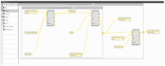 Each of those autopilots has dedicated software for tuning the controllers and planning the mission. Both of them are intuitive and easy to use. Veronte provides Veronte Pipe 6.4.52 software, in which the operator has to design an autopilot structure with control loops and PID regulators. The design process involves arranging blocks in a designated area and connecting them to various signals, providing users with a detailed view inside the control loops. While this approach may be more time consuming compared to Ardupilot, it provides operators with a thorough understanding of the inner workings of the autopilot. An example of such an autopilot design is shown in Figure 6.
