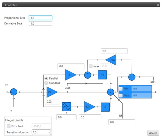 The grey blocks presented in the figure above represent PID controllers whose parameters are set by the user. Depending on the operator, it may be a simple PID controller or a more complex one. Figure 7 shows the content of this block.