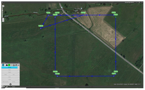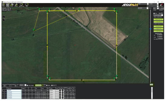 For Ardupilot autopilots, the MissionPlanner 1.3.80 software was used. This is ground control station software dedicated to planning, monitoring, and controlling UAV missions. It also provides tools for the real-time visualisation of flight data and the configuration of vehicle parameters. Figure 9 shows the part of the MissionPlanner responsible for planning the UAV mission. This is a user-friendly tool where waypoints can be placed on a specific point on the map by the operator or imported from a csv file.