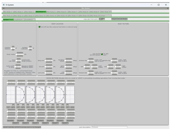 To replicate the environment of the mission, the X-Plane simulator was chosen. It was chosen because of the customisation options of the model and environment. The aerodynamic model of the octocopter was designed in PlaneMaker 11.55, so the aerodynamic forces can be calculated by the simulator. Parameters such as the mass and moments of inertia were taken into account during the design process. One of the drawbacks of this approach is that it is impossible to import the model from any of the CAD files; the user is obligated to redraw the model. Figure 11 presents the PlaneMaker tool.