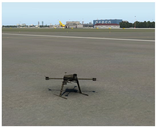 The X-Plane simulator enables the application of weather disturbances such as wind, rain, and fog. The same environmental conditions can be replicated in many simulations. The graphics of the simulator are also an advantage; the real world can be accurately visualised, which is a big plus. Figure 12 shows the mission visualisation in the X-Plane simulator. For this purpose, version 11.55 of X-Plane was used.