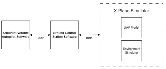 Software-In-The-Loop simulations consist of autopilot software, ground control station software, a dynamic model of the UAV, and an environment simulator. The simple diagram of SIL is presented in Figure 13.