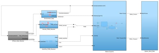 The communication between the components is conducted by using the UDP protocol. The frequency of the data coming from the X-Plane to the autopilot is set to the maximum possible value, equal to 100 Hz. The X-Plane sends data such as the acceleration of the UAV in the body frame, angular velocities, orientation, global coordinates, and position of the object. Those data are simulating the IMU, AHRS, and GPS measurements. The interface between the X-Plane and autopilots software was implemented in the Simulink Model. Figure 14 presents its structure; it consists of five blocks that exchange data between them. A block called ‘XPlane Data receive’ is responsible for receiving and parsing the data that the X-Plane sends during the simulation, and then those data go to the block called ‘Environment Data’, where the gravity acceleration and air density are computed, and ‘Veronte PWM Receiver’ and ‘Ardupilot PWM Receiver’, where the signals with states are sent to the autopilots software. The outputs from those two blocks are the PWM signals, which were calculated based on the simulation data. In the ‘APInterface block,’ those signals are translated and transmitted to the X-Plane simulator, where they are directed to the motors of the octocopter model.