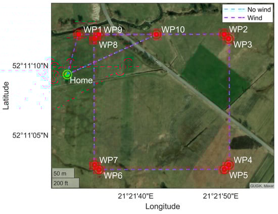 The comparison of the autopilots was conducted in three distinct mission scenarios. The first mission is a flight along a predefined trajectory, which is presented in Figure 15. The starting point and other initial conditions are the same for each mission. Those trajectories were imported into dedicated ground control software to perform the predefined missions. In the second mission scenario, the UAV follows the same trajectory as in the first scenario, with the additional inclusion of a weather disturbance, which is a northward wind with a magnitude of 5 m/s. The third scenario is a rapid deceleration from 25 to 0 m/s.