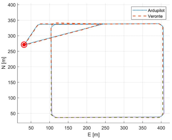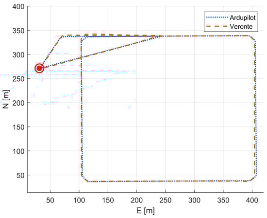 Starting with the mission-planning stage, both autopilots demonstrated user-friendly interfaces and ease of use. No problems were encountered while importing the waypoints to the ground control software. In the context of designing and tuning autopilot algorithms, the Ardupilot demonstrated much more convenient methods and tools. The main autopilot parameters have to be set by the user, such as the proportional gain of the orientation control loop and proportional, integral, and derivative gains for the angular velocity control loop, while in the Veronte autopilot, the whole structure of the autopilot has to be created, including the inner and outer loops of the control system. This complexity contributes to its increased reliability and the operator’s awareness of what is happening within the control loops.