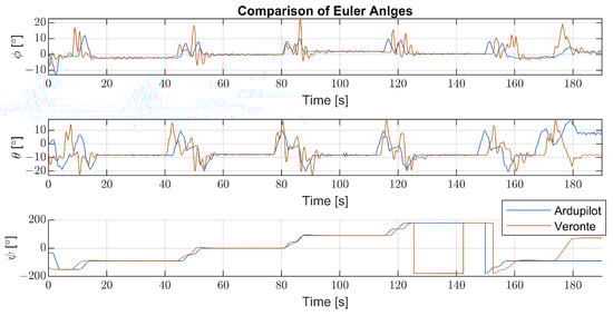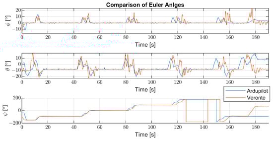Figure 17 presents the orientation of the simulated object during the missions, containing data obtained from both missions using the Veronte and Ardupilot autopilot. The figure contains graphs on which the change in the roll, pitch, and yaw angles during the mission is demonstrated. The data in blue represent the Ardupilot data, and the data in red correspond to the Veronte data.