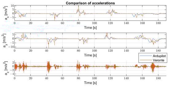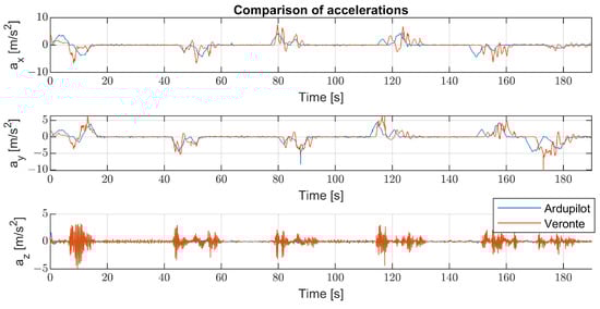Figure 18 presents the accelerations relative to the body frame of the model that were obtained during the missions. It is the dynamic acceleration due to motion or external forces (including the gravitational components). This focus on variations in acceleration offers critical insights for analyzing motion, estimating orientation, and supporting various dynamic applications. The set of three figures is demonstrated; on the first graph, the acceleration along the x-axis in the body frame is presented. The second figure shows the acceleration along the y-axis and the acceleration along the z-axis in the third figure. On each of them, the data derived from the simulations using Ardupilot and Veronte autopilots are compared.