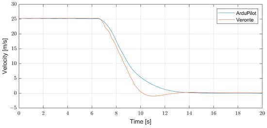 This subsection aims to present the data obtained from the final scenario, involving a rapid deceleration from 25 to 0 m/s. The flight data obtained from two simulations using two different autopilots are compared and visually represented on the graphs. Figure 22 shows the comparison of the change in velocity during the mission; in both cases, the deceleration was initiated just prior to the seventh s.