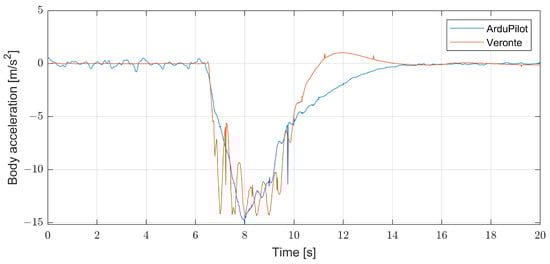 The data presented in blue correspond to the data obtained during the simulation, where the Ardupilot autopilot was tested, while the red colour represents data obtained during the Veronte autopilot testing. It can be observed from the graph that for both autopilots, the response times were approximately 3 s. After that, the velocity of the object is constant. It can be seen that the object controlled by the Veronte autopilot reached 0 m/s more quickly but was experiencing overshooting. Figure 23 shows the change in acceleration during the missions of Veronte and Ardupilot.