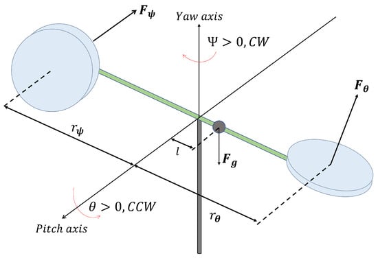 where and are the pitch and yaw angles, respectively. Their velocities are given by and . The thrust force constants are given by , and . The control input voltage for the pitch and yaw angles are given by and , respectively. The parameters of the system are shown in Table 1.