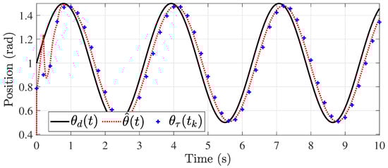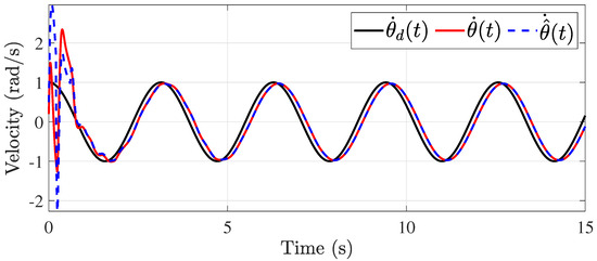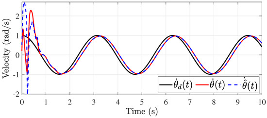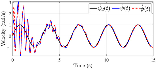 The second simulation is focused on showing the system’s effectiveness under time-varying delays in the control signal and output. For this, it is considered that the maximum delay is s and the varying function is as shown in Figure 8. The simulation results are shown in Figure 9, Figure 10, Figure 11, Figure 12, Figure 13 and Figure 14. The control of the pitch and yaw positions is shown in Figure 9 and Figure 10, respectively. In this case, the control is more challenging because of the higher delay values, but the control is satisfactorily achieved. This is evident in Figure 11 and Figure 12, where the velocities are shown, respectively. However, it is important to highlight that the estimation of the system uncertainties is achieved, as shown in Figure 13 and Figure 14.