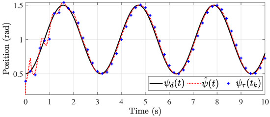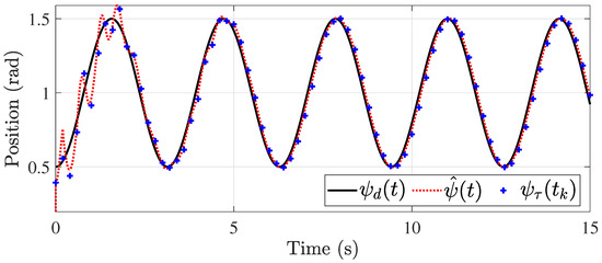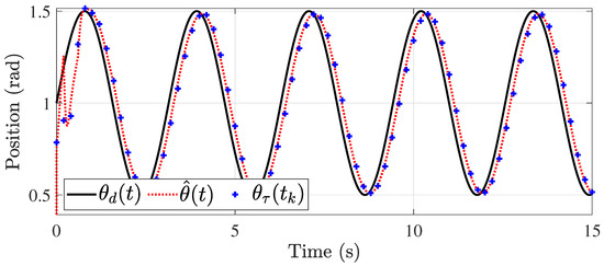 The first simulation considers the case where the control signal presents a constant delay. For this purpose, s. The simulation results are shown in Figure 2, Figure 3, Figure 4, Figure 5, Figure 6 and Figure 7. The estimate of the unknown parameters present in the input signal by the observer is shown in Figure 6 and Figure 7. The control of the pitch and yaw positions are shown in Figure 2 and Figure 3, respectively. The delayed measurements of each of them are denoted by and are only acquired in sampled intervals as mentioned above (). However, the designed observer achieves the estimation continuously to control the system. The speed control is shown in Figure 4 and Figure 5. It is important to note that for PD control, the knowledge of the velocities is needed, i.e., , which, in this, case are obtained from the observer, and no other extra algorithms are needed to know these variables. The advantage of the observer structure is demonstrated in Figure 6 and Figure 7, where the estimation of the unknown values and are shown, respectively. These help to achieve better control, as the values do not have to be increased further to reduce the error due to uncertainties.