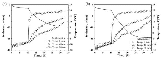 Frost heave might have occurred during freezing of the case III specimens (Figure 7c,d), but this is likely to have been minimal (~0.2 mm). This frost heave was attributed to volume expansion during the phase change of pore water to ice. Afterwards, the bottom temperature controller was raised to 10 °C. The resulting settlement was insignificant and similar to the heave amount.