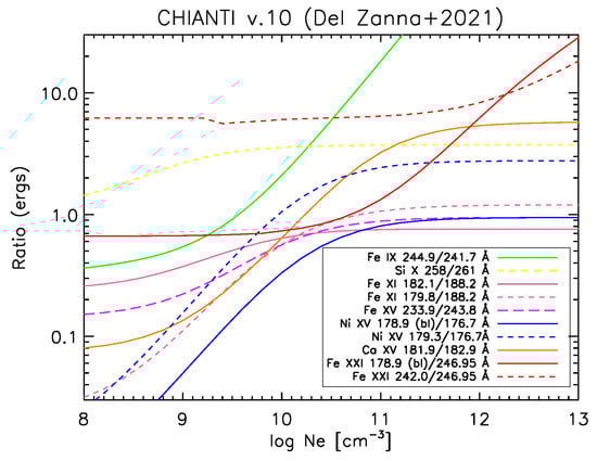 Figure 1 provides a summary of the main diagnostic ratios for SISA, although other ones are available. CHIANTI version 10 [] was used. The ratios cover a wide range of temperatures and are sensitive to a wide range of densities. Note that the Fe IX ratio is the best density diagnostic for the solar corona, but has never been observed routinely. Also note that the Fe XXI ratio is one of the best ones across all wavelengths in terms of measuring the low electron densities which are expected to be present during the heating phase. Most other density diagnostics of flare lines, from the X-rays to the UV, are sensitive above 1012 cm−3.
