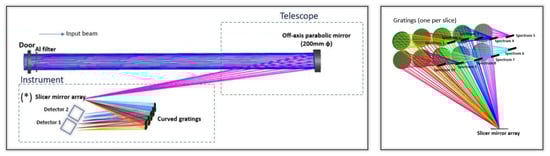Two subsystems are identified: the telescope and the integral field spectrograph, with a total of three surfaces. To optimise efficiency, the telescope is composed of one off-axis parabolic mirror, with an aperture of 200 mm diameter and an effective focal length of 3 m. At its focal plane, the array of slicer mirrors, each one of them with different orientations, divides the image of the field into thin slices of 15 µm. To cover a field of view of 100″ × 100″, a hundred slicer mirrors are needed, with a rectangular shape and whose dimensions are 3.64 mm length by 15 µm width. The slicer mirror array decomposes the incoming beam into as many sub-beams as the number of slicer mirrors, generating a pupil for each one of them. At the pupil position, an array of curved gratings will disperse the light and focus the beams at their focal length. Each grating will produce the spectrum associated with a slice of the field. The different orientations for the gratings are defined to distribute the spectra on the detectors. These orientations are fixed, with no moving mechanisms.