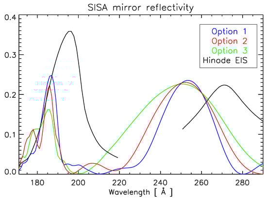 For the simultaneous observation of the two spectral windows, a dual-band multi-layer coating is being designed for SISA at the National Research Council of Italy, Padova. Considering the required operational spectral bands for SISA, the most efficient coatings in terms of efficiency were identified to be the three-material multilayer Al/Mo/B4C [] or, alternatively, the Al/Mo/SiC []. Both coatings show very good long-term stability, and in the case of Al/Mo/SiC, its reliability has been proven through its successful use in the Solar Orbiter/EUI instrument. The multiband response required for SISA was obtained using a design consisting of a superposition of two periodic multilayer stacks separated by two or three buffer layers. The coating optimization was performed using a genetic algorithm, following the procedure previously described in Ref. []. Figure 5 shows the three options obtained with an Al/Mo/B4C multilayer, among which Option 3 is the preferred alternative due to it offering the broadest response, with a signal near 220 Å. Similar results can be obtained with the Al/Mo/SiC multilayer.