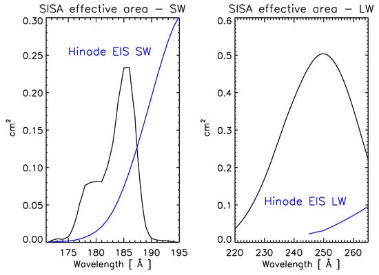 A preliminary estimation of the throughput has been performed. The effective area for SISA is represented in Figure 6 (in black), compared to Hinode/EIS (in blue). To calculate the effective area, we have considered the following components: (1) a front Al filter, the same used for SDO/AIA, but with an improved mesh transmission of 95%, compared to the AIA one (85%). Such an improved mesh has already flown on the Hi-C sounding rockets. The AIA filters have shown little degradation at the SISA wavelengths, probably thanks to their carbon layer, but alternative coatings will be considered. (2) Two mirror reflectivities (one for the primary and one for the slicer mirrors) using the multilayer option 3; (3) A third reflectivity using the same multilayer for the grating, with an efficiency of 35%, the same measured for the Hinode EIS grating in the long wavelength channel; and (4) The same quantum efficiency of the EIS CCD, 0.85. A secondary focal plane filter has not been included to maximise throughput, although a rotating wheel of redundant focal plane filters should be included.