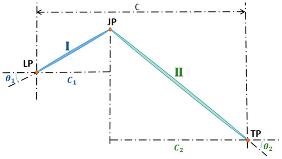 To solve such a problem, two-flat-plates assumption for high cambered turbine blade is initially proposed here as seen in Figure 2. () and () are the axial chord length and the stagger angle for section ‘I’ (‘II’), respectively. LP (TP) represents the leading edge (the trailing edge) point and JP is the junction point of the entire segment and is also the connection point between the section ‘I’ and the section ‘II’. In such assumption, that how to couple the two sections with different parameters like stagger angles and chordal coordinates carry paramount importance.