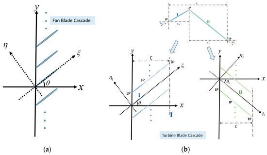 Coordinate systems with different assumptions: (a) Coordinate system with one-flat-plate assumption (fan blade cascade); (b) Coordinate system with two-flat-plate assumption (turbine blade cascade).