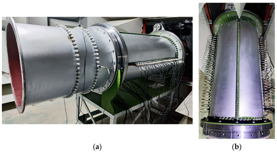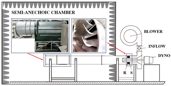 The sketch of the NPU-Turb is depicted in Figure 4. After the downstream of the turbine blade row, there is a rotating measurement duct for mounting a microphone array to collect sound pressure data at different circumferential and axial locations, after which, there are two-turn fixed microphone arrays whose signals can be used directly for mode-decomposition at low-frequencies. Additionally, in order to reduce the influence of external ‘dirty’ sources on microphone signals, only the measurement duct is installed in the semi-anechoic chamber and the remaining parts are located outside. The basic design parameters of the NPU-Turb are shown in Table 1.