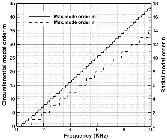 Figure 5 gives the maximum cut-on modal orders below 10 KHz of the NPU-Turb at the designed rotation speed. The maximum values of the circumferential modal order m and radial modal order n are, respectively, 44 and 14. In order to achieve the accurate identification of the duct acoustic modes for experimental measurement, sound pressure signals need to be collected at more than 88 circumferential locations at one fixed axial location and the number of turns of the circumferential microphone array distributed along the axial direction should be at least 28 without separating incident and reflected waves. As a result, two equally spaced linear axial arrays 180° apart, each including thirty microphones, are applied in this experiment and sound pressure data are collected every 4°, as is shown in Figure 6. In addition, there are four fixed microphones behind the rotating measurement duct for mode-decomposition using the reference microphone method.