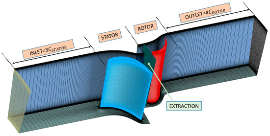The developed RI-TP model requires running RANS to provide the input parameters. The main inputs are the circumferential-averaged radial-distributed turbulent kinetic energy and the turbulent dissipation rate at the leading edge of downstream blade. As Figure 7 shows, the computational domain contains four parts: inlet region with three-times stator axial chord length, stator region, rotor region and outlet region with four-times rotor axial chord length. The plane named ‘EXTRACTION’ located at the rotor leading edge is used to extract the turbulent information. Then, the effect of the axial location of ‘EXTRACTION’ on the model prediction results will be discussed below.