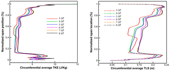 The changes in circumferential mass-averaged TKE and TLS (turbulent integration length scale) with a nodes number have been given in Figure 8. It indicates that turbulent information can be considered unchanged when the nodes number is larger than 7 million for the computational region shown in Figure 7. As a result, the case of 7 million nodes is used.